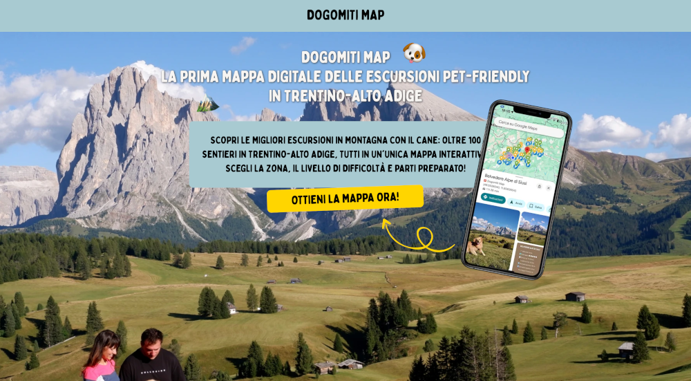 DOGOMITI MAP è una mappa digitale pensata per chi viaggia (o vive) in Trentino con il proprio cane. Il progetto nasce per rendere più accessibili e chiari i sentieri, i luoghi e le strutture dog-friendly sul territorio. L'obiettivo: un sito leggero, bello da navigare e semplicissimo da usare, anche da mobile.